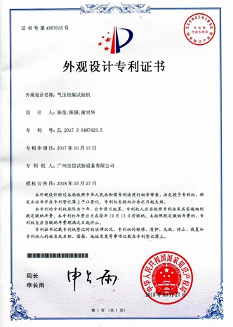 壓力浸水試驗機-外觀專利證書【岳信公司】 氣壓檢漏試驗機-外觀專利證書【岳信公司】